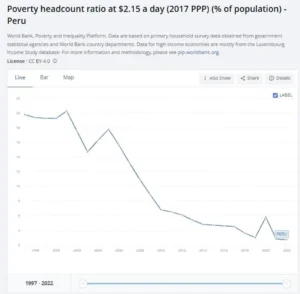 Between the early 2000s and 2019, Peru saw an average annual GDP growth rate of 5–6 %, one of the fastest-growing economies in the region during that period. These solid economic fundamentals allowed the country to weather the 2008 financial crisis and the 2014 commodity price shock better than other countries. Economic growth also led to a huge decline in poverty rates, which fell from over 55% in 2001 to approximately 20% by 2019. I have traveled to Peru fairly often, and one can see the impact of sustained economic development, which particularly in urban areas has contributed to a growing middle class.